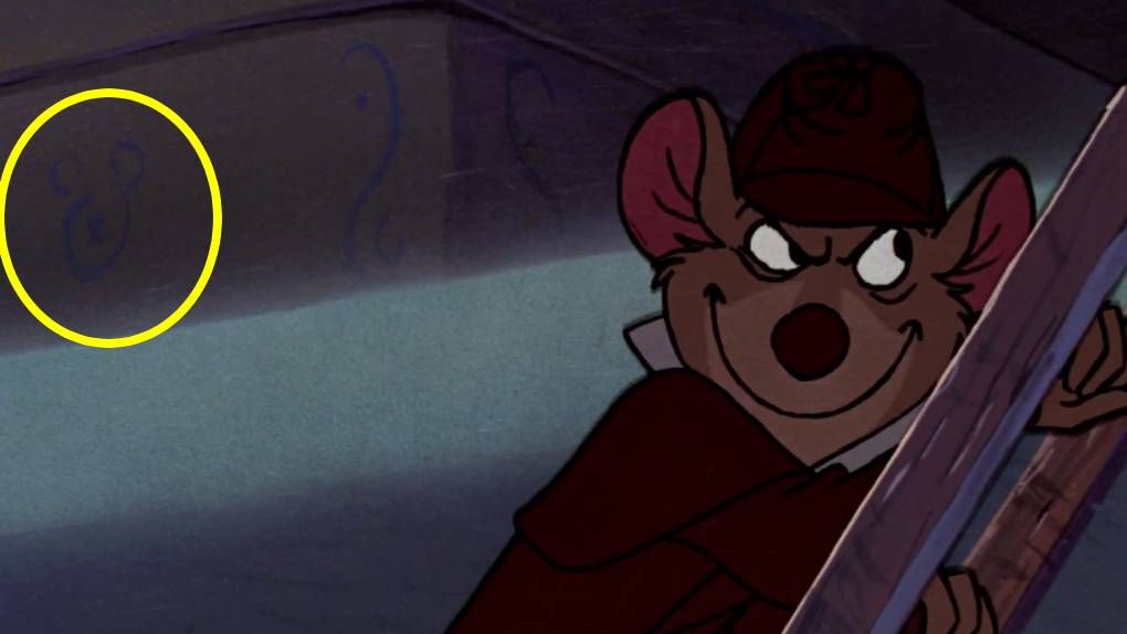 La mascotte des studios enchantés fait d'ailleurs une autre petite apparition dans cette scène, lorsque Basil, Dawson et Olivia enquêtent dans le magasin de jouets. Ce motif dessiné sur le mur (à gauche) semble en effet reproduire les trois cercles qui forment traditionnellement le visage de Mickey.