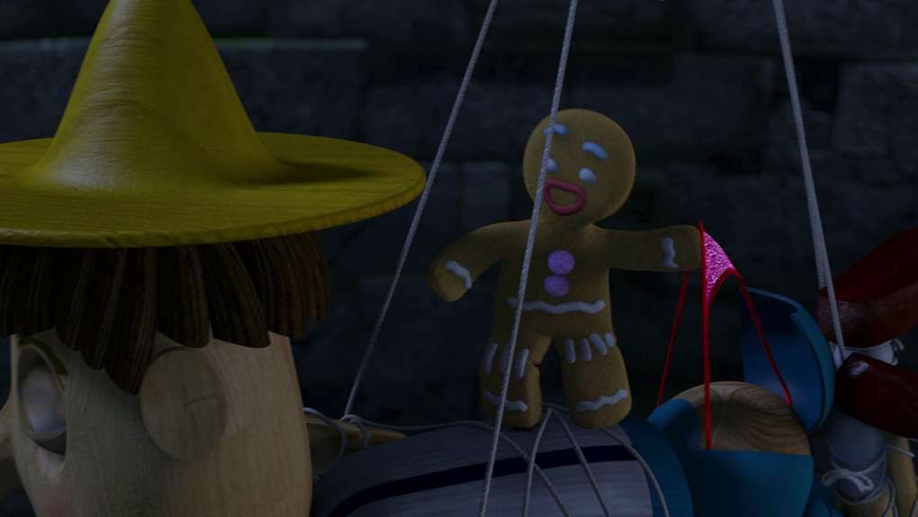 Au moment où il doit mentir pour que son nez s'allonge et que le sauvetage de Shrek puisse fonctionner, le petit pantin de bois s'exclame, sous les conseils de Tibiscuit, qu'il porte "une petite culotte en dentelle." Voyant que rien ne se passe, le bonhomme en pain d'épices constate que Pinocchio arbore en effet... un string rose.