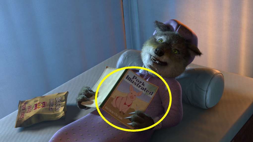 Au tout début de Shrek 2, lorsque le Prince Charmant arrive au château de Fiona et tombe nez à nez avec le Grand Méchant Loup, ce dernier est en train de lire une revue intitulée "Pork Illustrated" et sur laquelle on peut voir... un cochon en sous-vêtements.