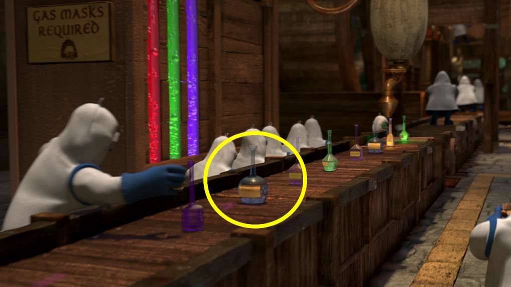 Parmi les très nombreuses fioles qui défilent dans l'usine à potions de Marraine la Fée, l'une d'elles porte une étiquette marquée du mot "Fiagra". Une autre plaisanterie destinée aux plus grands, à condition d'avoir l'oeil pour la repérer et de modifier la première lettre de l'inscription.