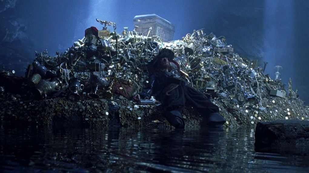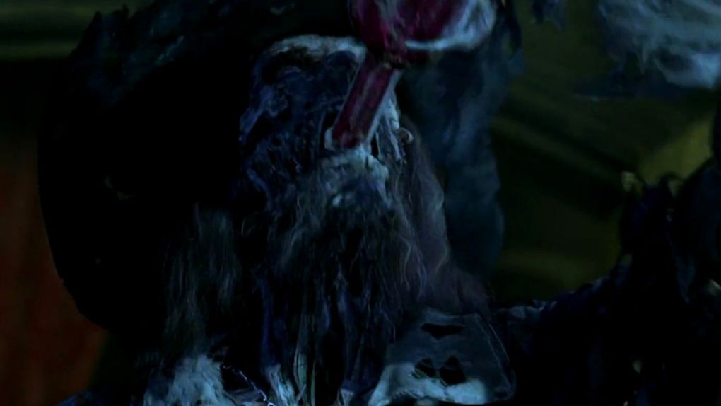Après avoir été occis par Jack Sparrow à la fin du film, Barbossa retrouve son aspect squelettique et s'effondre sur le trésor qu'il avait amassé à l'île de la Muerta. Il s'agit là encore d'un clin d'oeil à l'attraction originale des parcs Disney, dans le décor de laquelle on pouvait déjà observer un squelette gisant sur un tas de pièces d'or.