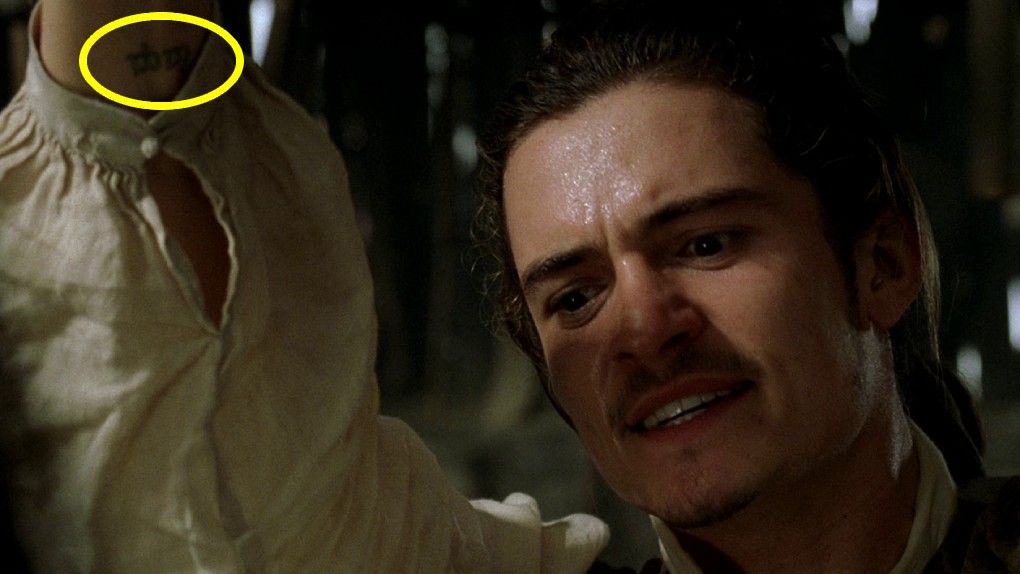 Lorsque Orlando Bloom croise le fer avec Johnny Depp (alias Jack Sparrow) au début du film, un peut apercevoir un discret petit tatouage sur le poignet droit de l'acteur. Cette marque, qui représente le chiffre "9" en elfique, est un souvenir de tournage qui lui vient du Seigneur des Anneaux. En effet, à l'instar de Viggo Mortensen, d'Elijah Wood et de chacun des neuf comédiens qui ont fait partie de La Communauté de l'Anneau dans la trilogie de Peter Jackson, l'interprète de Legolas s'est fait tatouer ce caractère sur le bras.