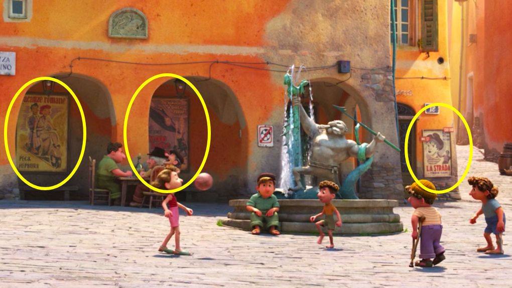Tout au long du film Luca, de nombreuses affiches de films placardées sur les murs de la ville de Porto Rosso apparaissent dans les plans. On aperçoit notamment La Strada de Federico Fellini, 20 000 lieues sous les mers de Richard Fleischer et Vacances romaines de William Wyler.