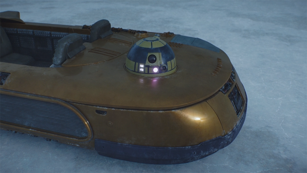 Difficile de ne pas esquisser un sourire en voyant débarquer un petit droïde aux commandes d'un landspeeder censé amener le Mandalorien aux docks... Un droïde astromécano facilement reconnaissable pour les fans de la saga intergalactique, puisqu'il est de série R2, celle d'un certain... R2-D2 ! Mais il repartira aussi sec, le Mandalorien ne goûtant que très peu la présence de ces robots.