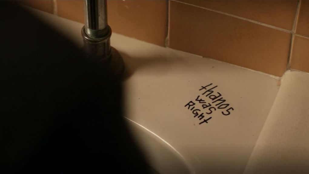 Dans les toilettes du théâtre où il a assiste à la comédie musicale, Clint Barton aperçoit un graffiti "Thanos was right" ("Thanos avait raison" en français). La disparition de la moitié de l'humanité est encore défendue par certains groupuscules, comme par exemple les Flagsmashers aperçus dans Falcon et le Soldat de l'hiver.