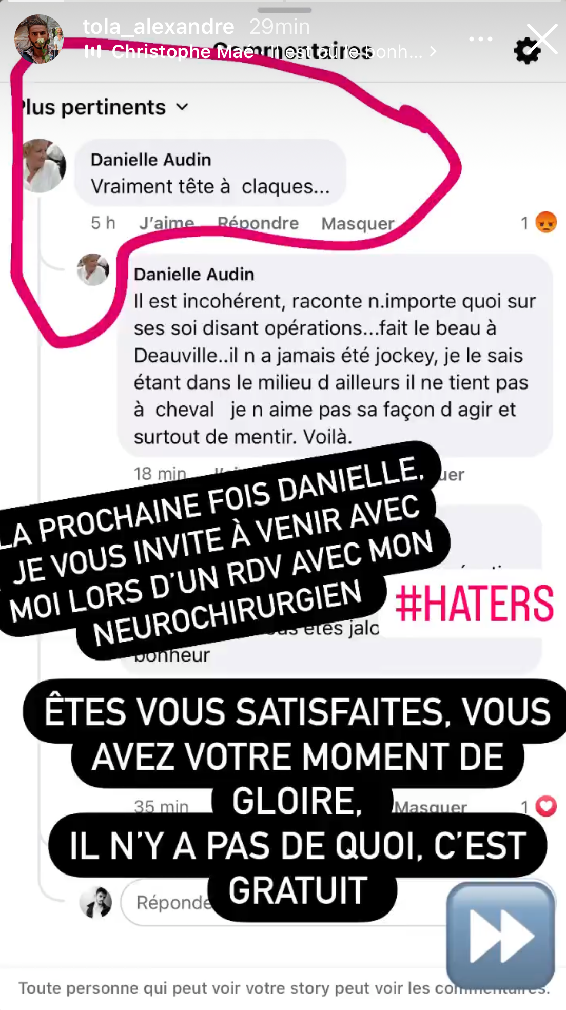 Alexandre, ancien prétendant de l'émission L'amour est dans le pré qui avait trouvé l'amour dans les bras de Mathieu, a posté une nouvelle story sur son compte Instagram ce dimanche 22 janvier 2023. Et le jeune homme a montré une nouvelle fois qu'il n'avait pas sa langue dans sa poche puisqu'il s'en est pris violemment à un internaute qui l'a critiqué. En effet, sur la photo, il dévoile le commentaire d'une femme sur Facebook qui a commenté : "Vraiment tête à claques. Il est incohérent, et raconte n’importe quoi sur ses soi-disant opérations…il fait le beau à Deauville. Il n'a jamais été jockey, je le sais étant dans le milieu d'ailleurs. Je n'aime pas sa façon d'agir et surtout de mentir. Voilà". Une attaque gratuite à laquelle il a tenu à répondre en légende : "La prochaine fois, je vous invite à venir avec moi lors d’un rendez-vous avec mon neurochirurgien. Êtes-vous satisfaites, vous avez votre moment de gloire, il n’y a pas de quoi c’est gratuit.”