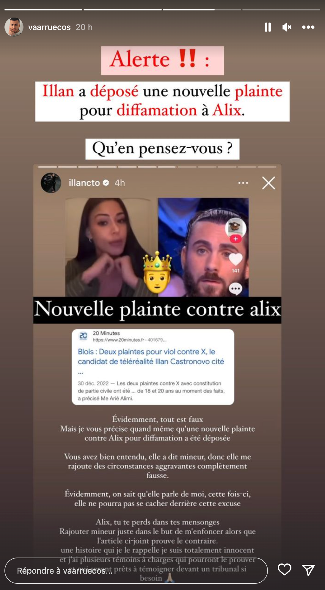 C’est une histoire qui ne cesse de faire parler d’elle et qui vient de connaître un tout nouveau rebondissement. Ce lundi 23 janvier 2023, Illan Castronovo a posté une nouvelle story sur son compte Instagram pour annoncer qu’il allait porter plainte contre Alix Desmoineaux pour diffamation. Il reprend un article de nos confrères de 20 minutes, titré Blois : deux plaintes pour viol contre X, le candidat de télé-réalité Illan Castronovo cité. Un article qu’il a accompagné de la légende suivante : “Nouvelle plainte contre Alix. Evidemment, tout est faux. Mais je vous précise quand même qu’une nouvelle plainte contre Alix pour diffamation a été déposée. Vous avez bien entendu, elle a dit mineure, donc elle me rajoute des circonstances aggravantes complètement fausses. Évidemment, on sait qu'elle parle de moi cette fois-ci, elle ne pourra pas se cacher derrière une excuse. Alix tu te perds dans tes mensonges (...) Je le rappelle, je suis toujours innocent et j'ai plusieurs témoins à charge qui pourront le prouver et qui seront prêts à témoigner devant un tribunal si besoin” a-t-il écrit.