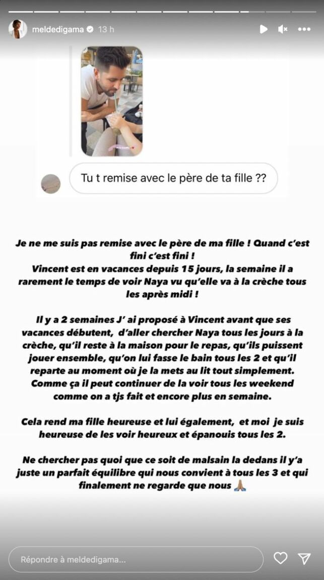 "T'es-tu remise avec le père de ta fille ?", s'est questionnée une abonnée de Mélanie, sur son compte Instagram. En effet, la mère de famille est apparue dans ses stories aux côtés de Vincent. Mais pour mettre les choses au clair concernant leurs retrouvailles, elle a répondu : "Je ne me suis pas remise avec le père de ma fille. Quand c'est fini, c'est fini ! Vincent est en vacances depuis 15 jours. La semaine, il a rarement le temps de voir Naya vu qu'elle va à la crèche tous les après-midi", a-t-elle précisé.