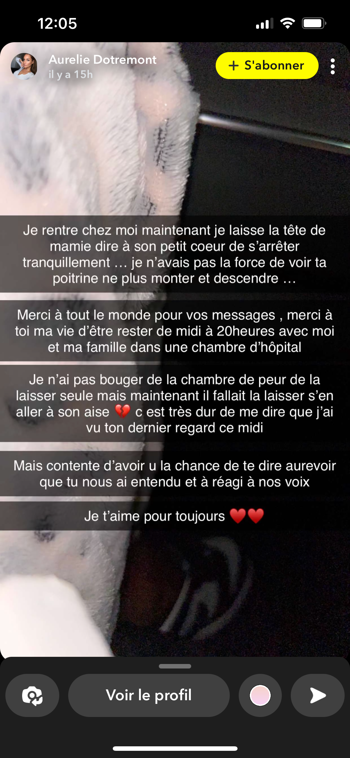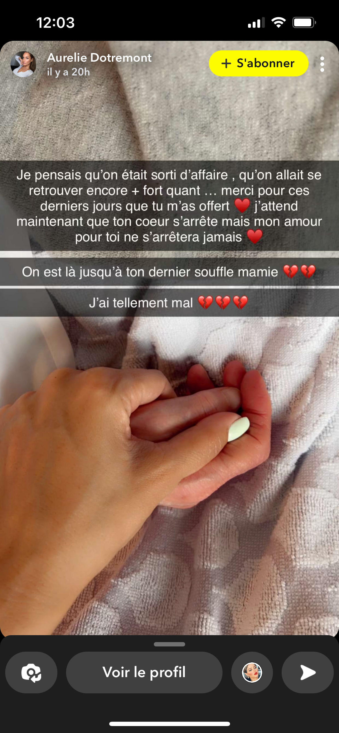 Elle redoutait ce moment. Ce mardi 23 mars 2023, après de longs jours d'attente et d'angoisse, Aurélie Dotremont vient d'annoncer le décès de sa grand-mère avec ce message posté sur ses réseaux sociaux : "repose en paix mamie", précédé de l'heure du décès (8h30) et suivi de six coeurs brisés. Une terrible nouvelle que la candidate de télé-réalité appréhendait, mais qui semblait inévitable au vu de ses dernières story postées sur Snapchat : "Je pensais qu'on était sorti d'affaire, qu'on allait se retrouver encore plus fortes qu'avant, merci pour ces derniers jours que tu m'as offerts. J'attends maintenant que ton coeur s'arrête mais mon amour pour toi ne s'arrêtera jamais" a écrit la jeune femme, seulement quelques heures avant l'heure du drame.