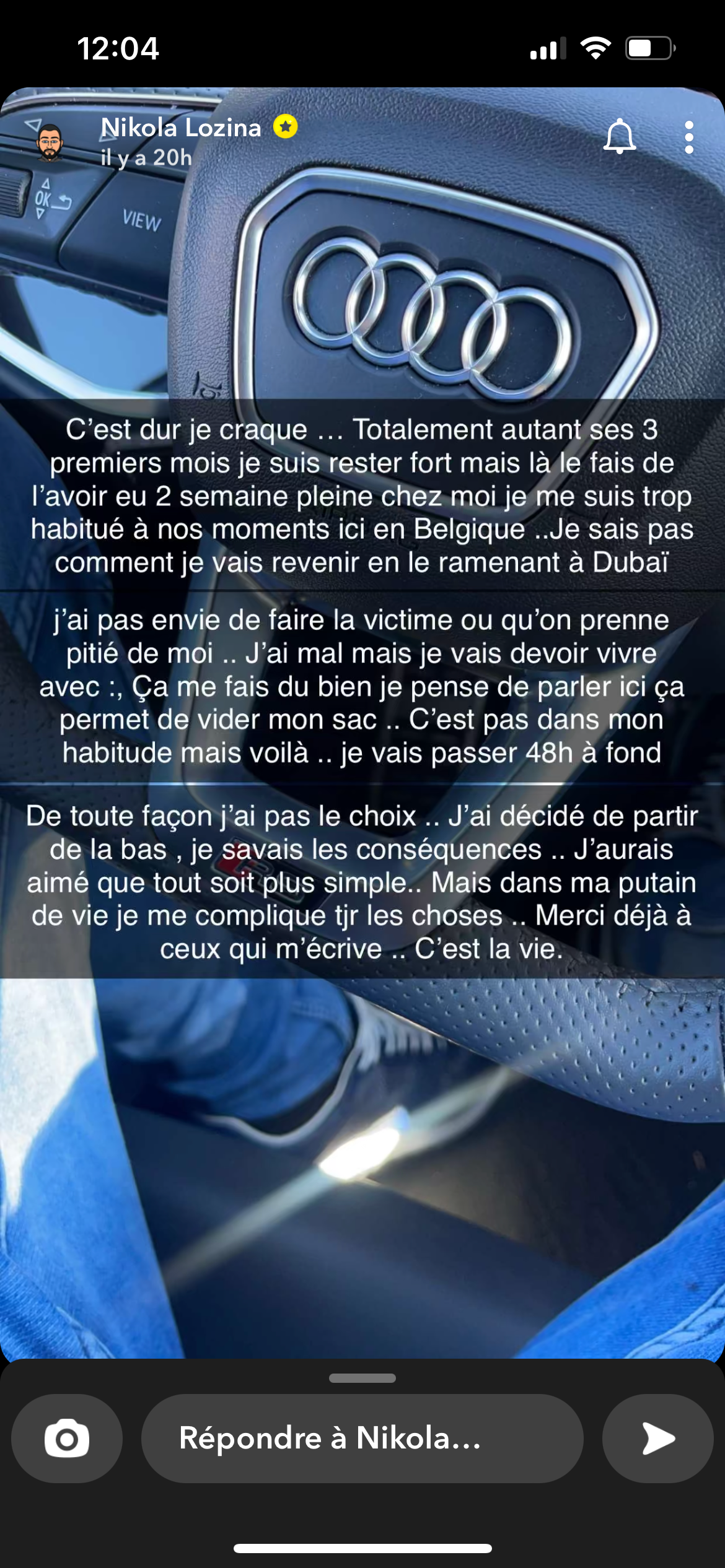 Gros coup de blues. C'est un Nikola Lozina en larmes et en totale déprime que l'on retrouve sur sur son compte Snapchat ce mardi 4 avril 2023. Et pour cause, après avoir gardé son fils Zlatan pendant deux semaines en Belgique, celui-ci va devoir rentrer chez lui, à Dubaï, chez sa mère Laura Lempika. "J'aime pas pleurer sur les réseaux pour faire la victime, mais ça me fera du bien de dire ce que je ressens. Depuis hier, ça va pas du tout parce que je vais devoir vite rendre mon enfant à sa maman et me reséparer de lui. J'ai bien aimé avoir ces moments en Belgique avec lui, ça m'a fait plaisir." commence-t-il par confier, seul dans sa voiture garée sur un parking belge.