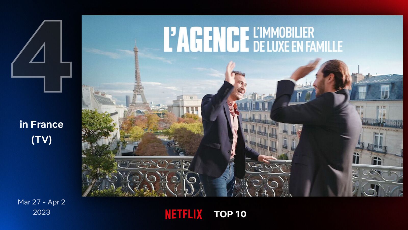 Netflix a publié son Top 10 des programmes les plus regardés par ses abonnés et surprise, coincé entre deux séries internationales, un petit programme français s'offre une confortable quatrième place. Il s'agit de la troisième saison de L'agence, l'immobilier de luxe en famille, programme original de TMC pourtant diffusée à l'antenne il y a moins d'un mois. Une entrée fracassante dans ce classement, établi sur les audiences françaises de la plateforme de streaming enregistrées entre le 27 mars et le 2 avril.