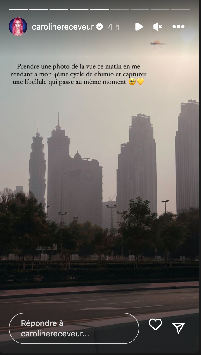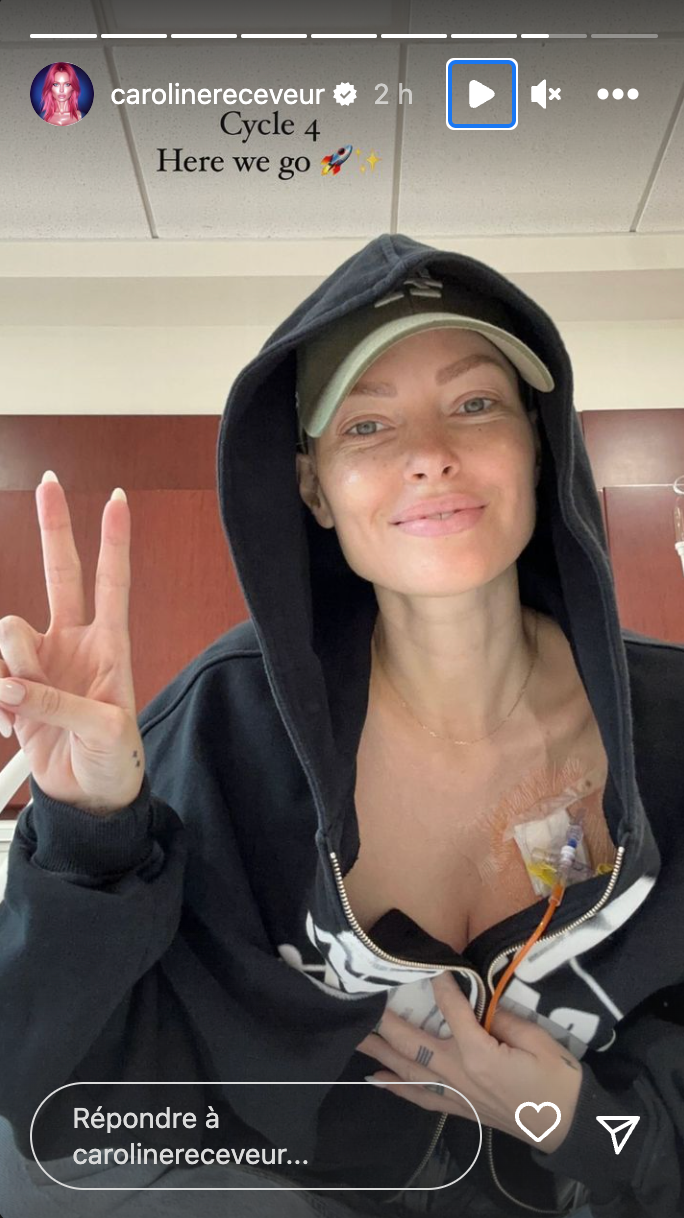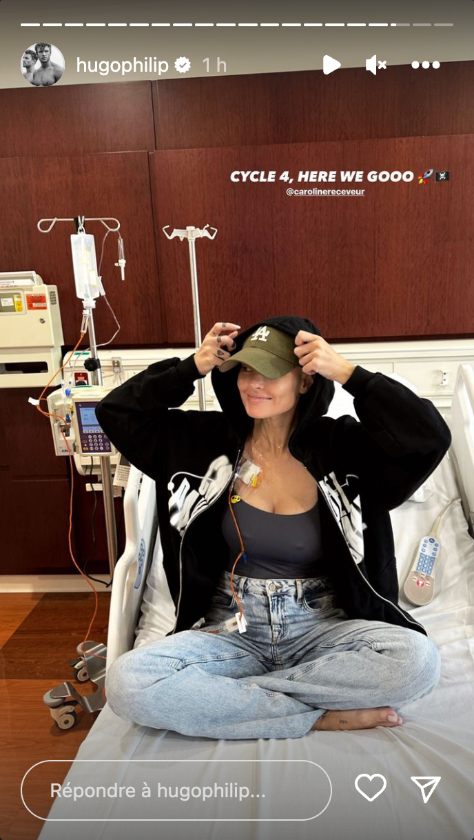 Depuis cette annonce choc et inattendue, la jolie blonde partage son nouveau quotidien semé d'embuches et de médicalisation. Ce lundi 28 août, soit un mois après avoir révélé la vérité sur ses réseaux sociaux, elle a ainsi posté une photo d'elle en pleine chimiothérapie. La maman de Marlon précise qu'elle rentre dans son quatrième cycle de traitement pour combattre ce cancer du sein : "Prendre une photo de la vue ce matin en me rendant à mon quatrième cycle de chimio et capturer une libellule qui passe au même moment" écrit-elle en story Instagram, visiblement troublée par cette coïncidence. Et de se dévoiler sur son lit d'hôpital, casquette et capuche sur la tête, fils reliés dans le cathéter inséré sous sa peau en dessous de la clavicule, mais toujours avec le sourire... sans doute grâce à son mari Hugo Philip.