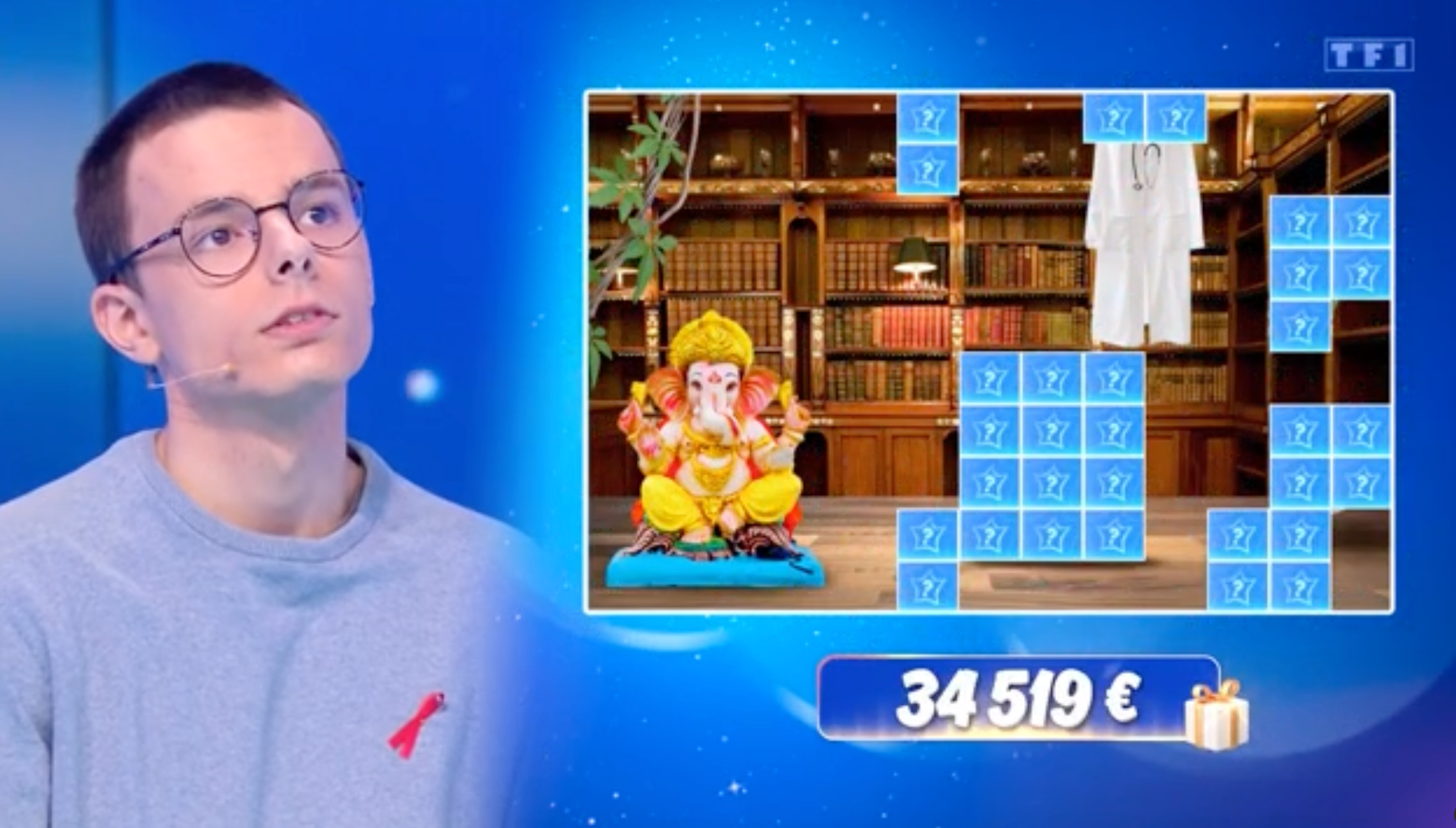 Une chose est sûre : le candidat, qui en est donc à sa 176ème participation, n’a toujours pas dit son dernier mot ! Lors de l’émission diffusée ce mardi 19 mars 2024 sur TF1, il a découvert un nouvel indice de l’étoile mystérieuse de mars. En effet, après un Coup fatal contre Benjamin, Emilien s’est adonné aux questions du Coup de maître, et a ainsi réussi à révéler les traits d’un indice de taille ! Alors que le fond de l’image dévoile une bibliothèque remplie de livres, les bonnes réponses d’Emilien ont cette fois permis de dévoiler… une blouse de médecin ! Suite à une erreur lors du Coup de maître, Emilien n’a cependant pas eu l’occasion de tenter l’étoile cette fois-ci. Reste donc à savoir si cette blouse de médecin lui permettra tout de même de mettre un nom sur la personnalité qui se cache derrière ces indices.