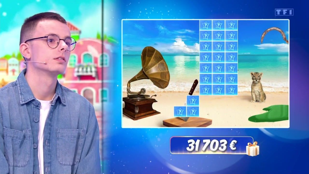 Plusieurs indices dont désormais clairement visibles sur l'étoile mystérieuse : il y a déjà le fond, une plage de sable blanc bordée d'un océan aux eaux turquoise. Puis on voit un lionceau, une faucille, un gramophone. Emilien vient de dévoiler, en bas à droite de l'image, une flaque verte. Enfin, au milieu de l'image, un indice commence à apparaître : il ressemble à un hachoir de boucher qui serait planté dans une planche à découper... mais cela reste à confirmer !