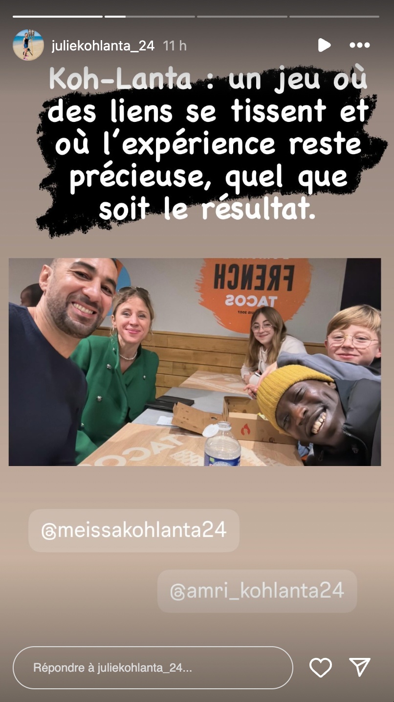 Pour rappel, le dernier conseil a été particulièrement houleux. En effet, Amri et Meïssa font preuve d’un sens de la stratégie qui a le don d’agacer les autres aventuriers. C’est en raison de leur alliance que Sébastien avait d’ailleurs été éliminé, en même temps qu’Aurélien. Et aucun des deux n’a digéré cette trahison ! De retour en France, plusieurs candidats ont coupé les ponts avec les deux stratèges, à l’instar de David, le dernier éliminé. Mais d’autres sont restés en contact avec eux malgré les tensions. C’est le cas de Julie, qui a posté une photo ce jeudi 16 mai en story Instagram. Elle apparaît dans un fast-food avec ses enfants, mais aussi Meïssa et Amri.