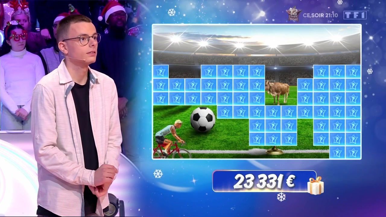 En attendant cette grande soirée, Emilien était sur le plateau des 12 Coups de midi le midi dans la quotidienne diffusée sur TF1 mardi 24 décembre, juste avant le JT de 13 heures, pour une 454ᵉ participation. Participation qui s’est soldée par une nouvelle victoire, et au cours de laquelle le jeune Vendéen a signé un Coup de Maître à 10 000 euros. Quelques cases de l’étoile mystérieuse du mois ont disparu, laissant apparaître un nouvel indice : une vache. L’animal s’ajoute aux trois indices précédemment dévoilés : un stade, un ballon de football et un cycliste.