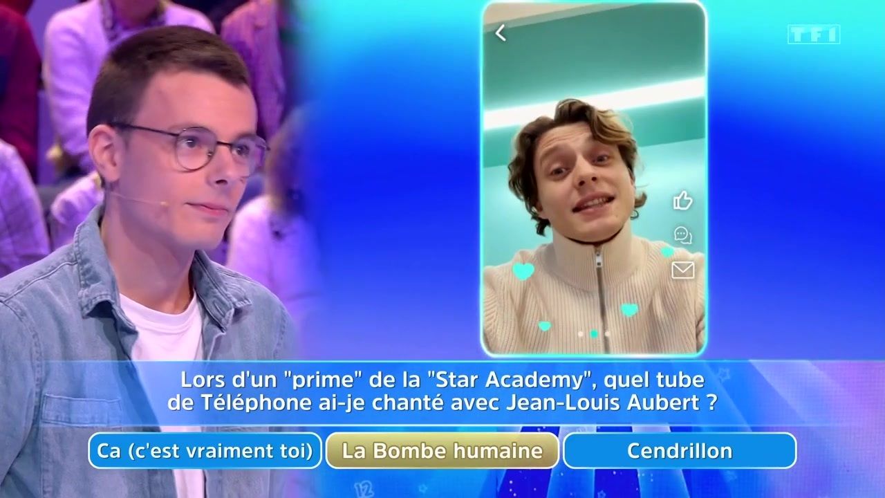 Tout semblait pour parfaitement ce dérouler ce jeudi 25 janvier 2025 dans Les 12 coups de midi. Emilien a éliminé ses adversaires et va tenter un nouveau coup de maître. Pour cela, il lui faut donner cinq bonnes réponses d'affilée. Après avoir répondu correctement aux deux premières questions, l'une sur la conjugaison française et l'autre de culture générale, voilà qu'apparait en visio Ulysse, candidat marquant de la dernière saison de la Star Academy. "Lors d'un prime de la Star Academy, quel tube de Téléphone ai-je chanté avec Jean-Louis Aubert" lui demande alors l'ancien académicien. Et Jean-Luc Reichmann d'ironiser sur le fait qu'Emilien a suivi tous les primes de l'émission (ce qui est totalement faux). C'est donc sans aucune conviction que le jeune champion répond "La bombe humaine". Erreur ! Car il s'agissait de "Ça (c'est vraiment toi)".